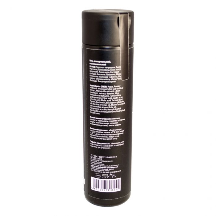 Інгредієнти: Гідролат петрушки, екстракт мучниці, шовковиці, білої лілії, солодки. Бетаїн цукровий, алое вера. Лимонна, молочна, гліколева, малікова і винна кислоти, папаїн. Ефірна олія евкаліпта, м’яти, чебрецю, лаванди, токоферол ацетат.