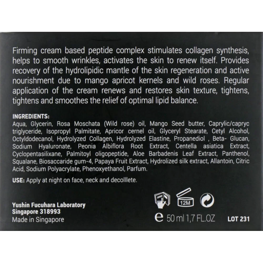A Complex Of Peptides, Wild Rose Oil, Mango Butter, Apricot Kernel Oil, Hydrolyzed Elastin (Fragment Of Elastin Vgvapg), Hydrolyzed Collagen, Hyaluronic Acid, Beta Glucan, D-Panthenol, Allantoin, Squalene