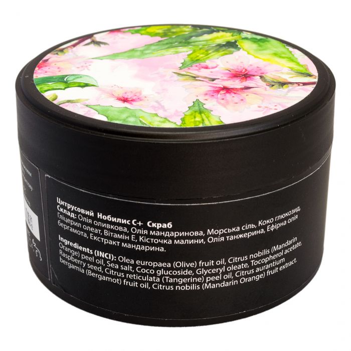 Сольовий скраб для тіла на основі екстракту мандарина і масло оливки. Препарат має властивості, що відлущує і очищає, зволожує, тонізує, стимулює регенерацію, вирівнює рельєф і колір шкіри. Прекрасно підходить до програми для схуднення і anti-age. За рахунок кісточки малини, володіє посиленим абразивним ефектом, що значно покращує відлущування рогового покриву і всмоктування поживних речовин в шкіру. Масло мандарина має потужну антисептичну, протигрибкову і протизапальну дію, відновлює клітини шкіри. Оливкова олія унікальна тим, що містить велику кількість сквалену, який сприяє зволоженню. Велика кількість вітаміну Е сприяє нейтралізації впливу вільних радикалів, через які шкіра швидше в’яне і з’являються зморшки. Вміщені в олії вітаміни А і D беруть участь в оновленні епідермісу, зменшують кількість ороговілих частинок шкіри. Підходить для всіх типів шкіри.