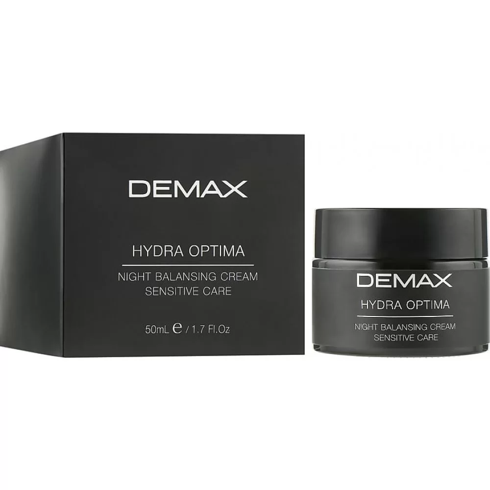 Demax Hydra Optima Night Balansing Cream Sensitive – цей легкий живильний та зволожуючий крем, призначений для щоденного застосування всіх типів шкіри. Він інтенсивно живить, зволожує, пом’якшує та заспокоює шкіру. Завдяки активним компонентам у складі, покращує та вирівнює тон та текстуру шкіри, інтенсивно відновлює епідерміс. Цей нічний крем чинить на шкіру антиоксидантну дію, бореться з віковими змінами та покращує захисні властивості шкіри. Ефективний також у боротьбі із запаленнями та подразненнями, оскільки швидко заспокоює шкіру.